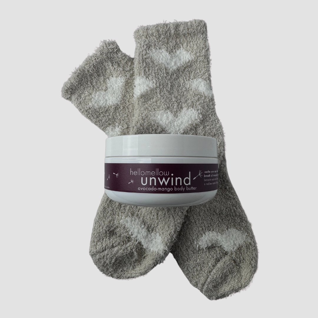 each set includes six full-size, spa-inspired products crafted in your chosen intention: a pink himalayan body scrub, body oil, body butter, energy shifting spray, bath salt, and lip butter — plus a bonus pair of cozy socks for your nightly butter-feet ritual.