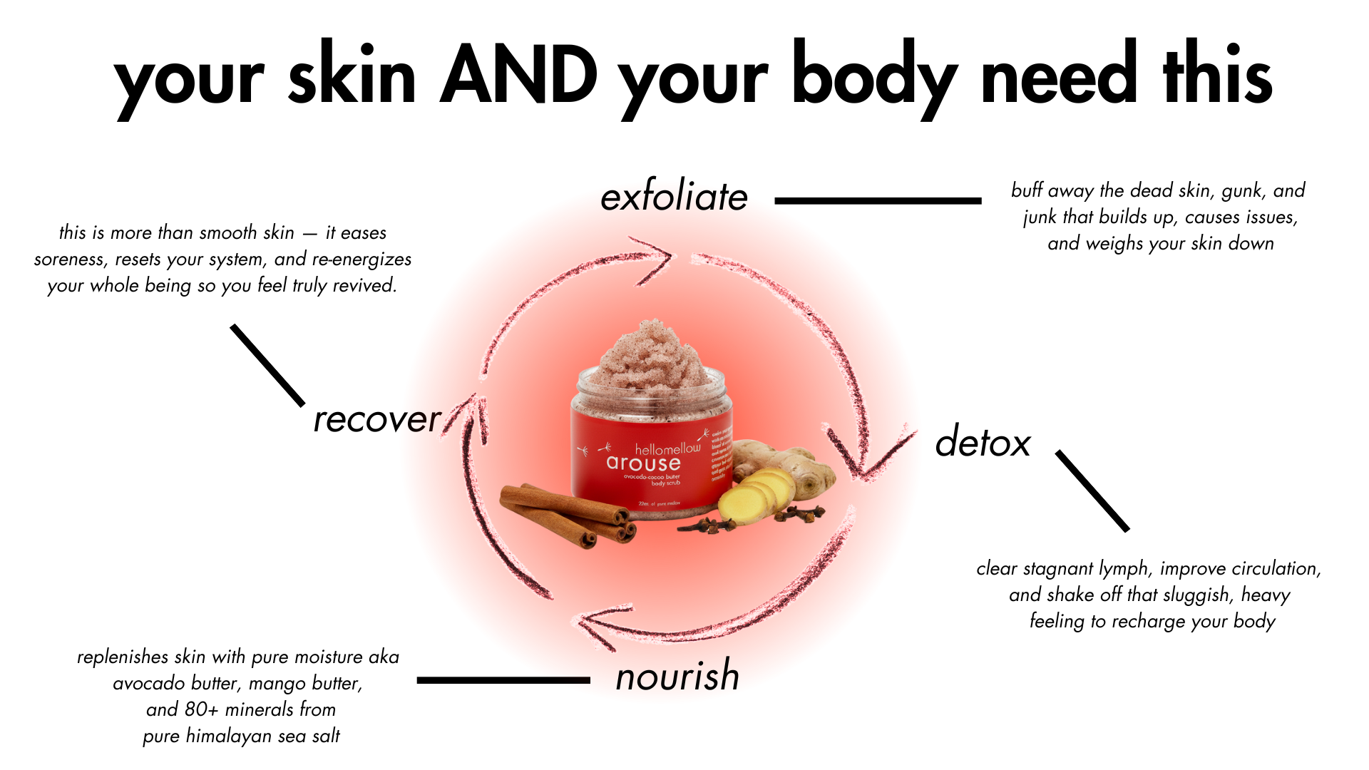 arouse body scrub uses mineral-rich pink himalayan salt to gently exfoliate while stimulating circulation and activating tired, dull skin and underlying tissue. as you massage it in, you can feel warmth build and skin come alive — not stripped or irritated, but energized and supported.