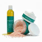 your ultimate 1-2-3 routine for strong, revitalized skin. pink salt stimulates circulation, dense butters repair, and oils hydrate deeply while peppermint, eucalyptus + rosemary essential oils boost clarity and confidence.