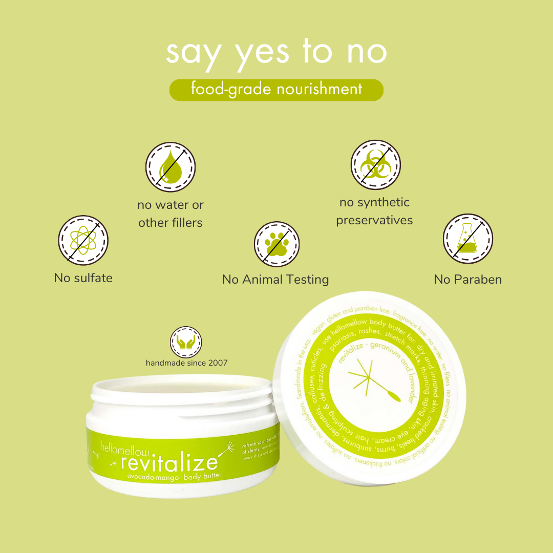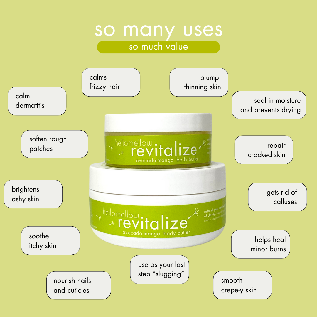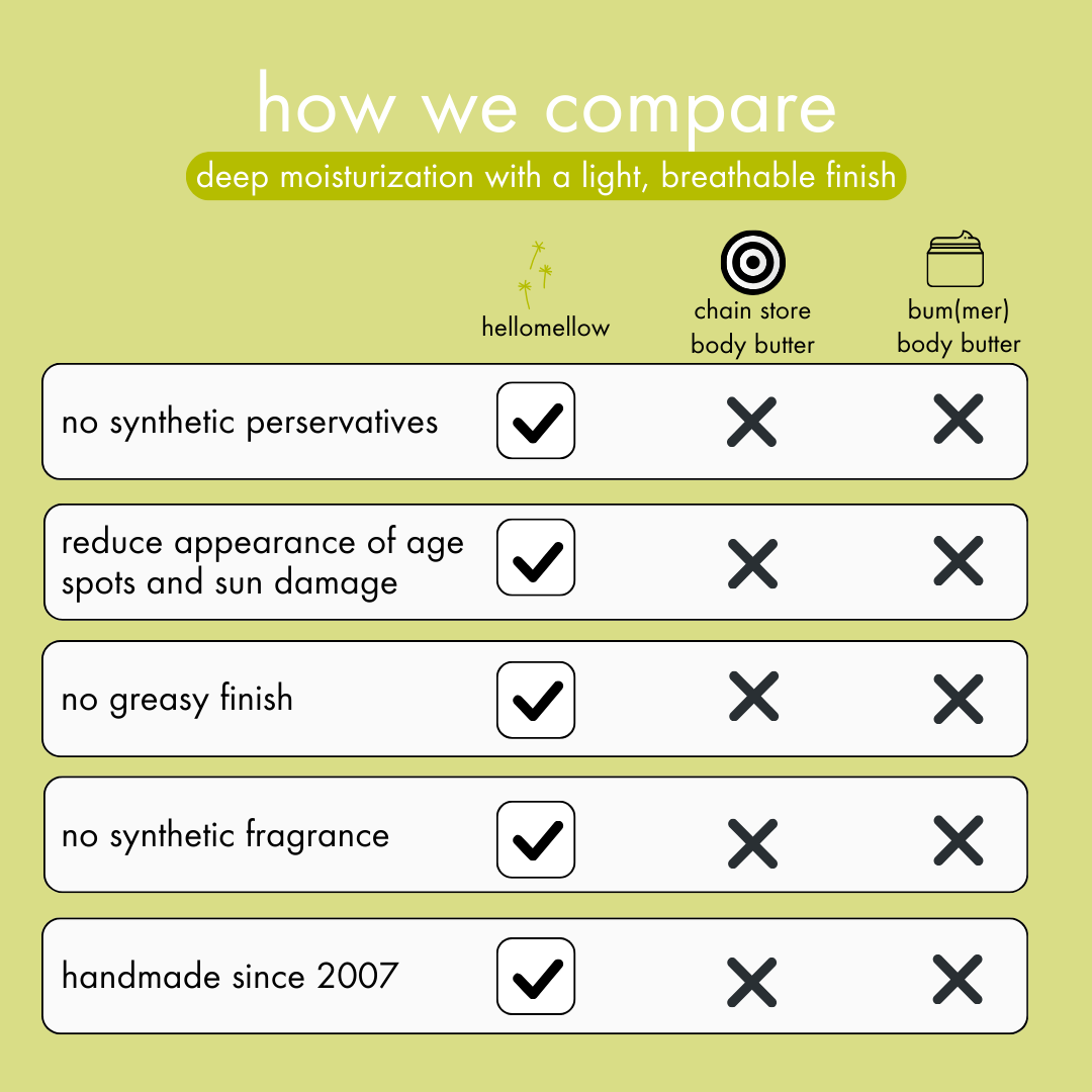 Psst: our customers have found a lot of other ways to use hellomellow body butter. Use it to mellow out dry and irritated skin, itchy skin, cracked heels, burns, sunburns, dermatitis, calluses, cuticles, psoriasis, ashy skin, rashes, stretch marks, thinning/aging skin, crow's feet, and even frizzy hair.
