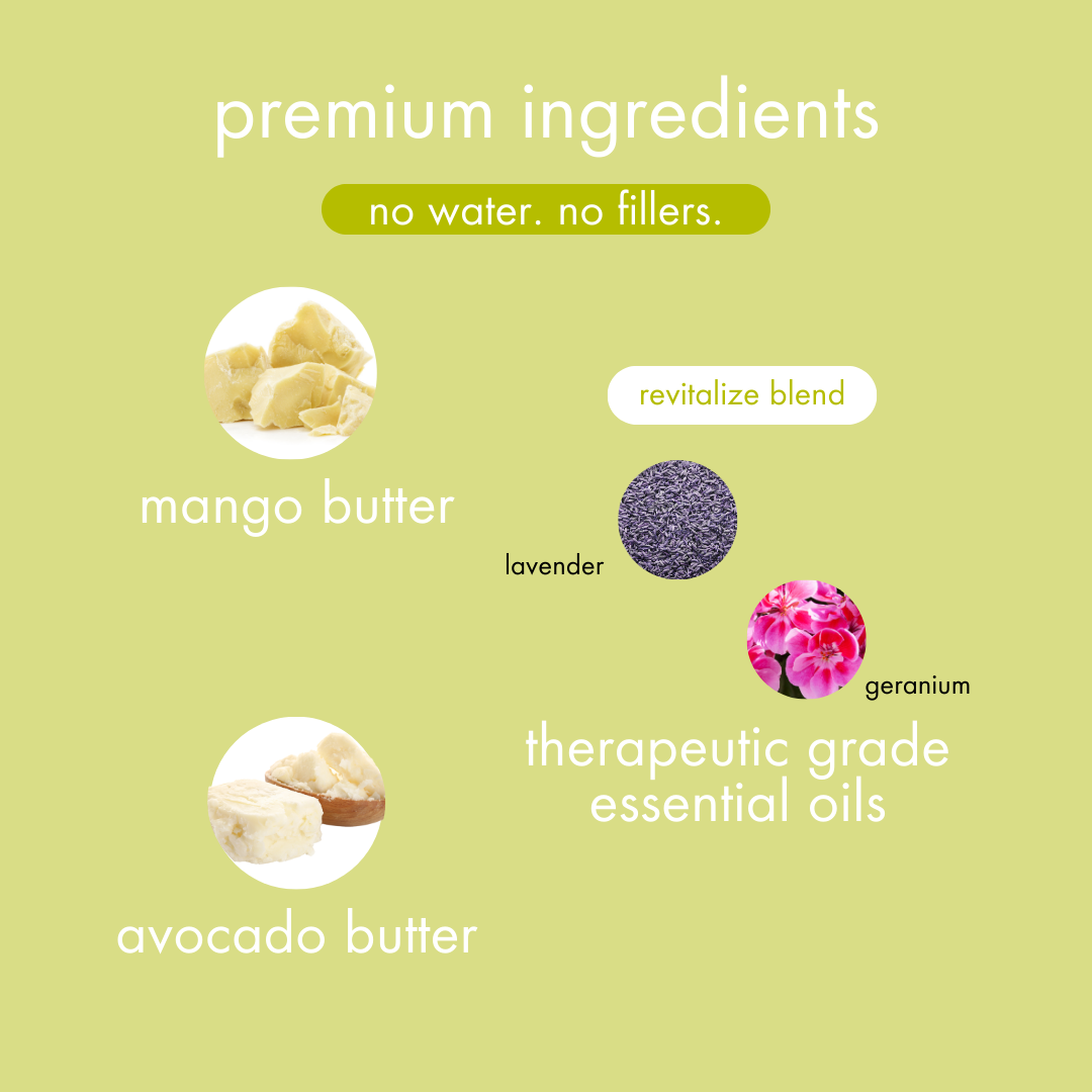 lavender + geranium uplift your senses as avocado + mango butters drench skin in lasting moisture. this renewing blend smooths rough patches, improves texture, and helps reveal stronger, more resilient, radiant-looking skin.