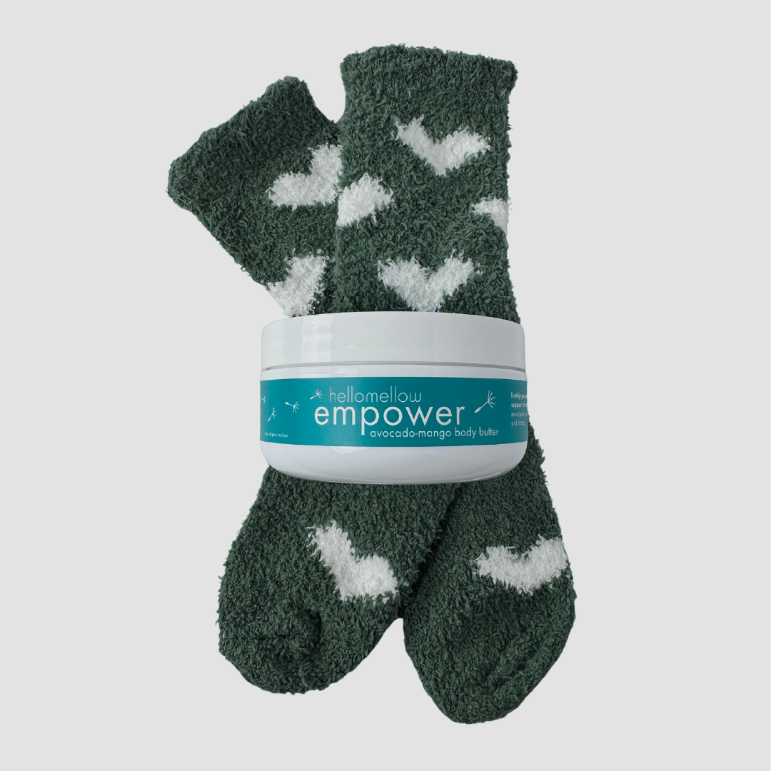 each set includes six full-size, spa-inspired products crafted in your chosen intention: a pink himalayan body scrub, body oil, body butter, energy shifting spray, bath salt, and lip butter — plus a bonus pair of cozy socks for your nightly butter-feet ritual.