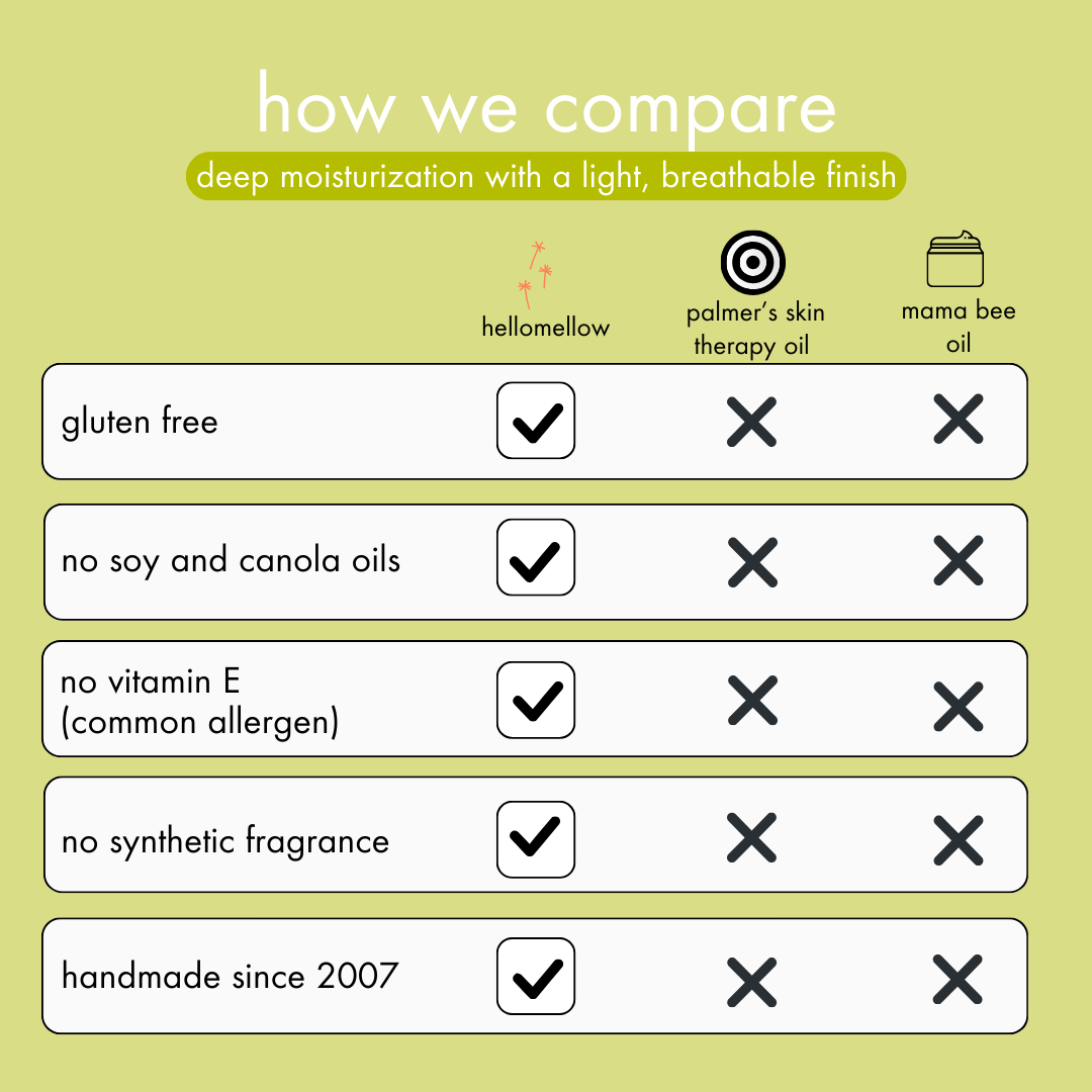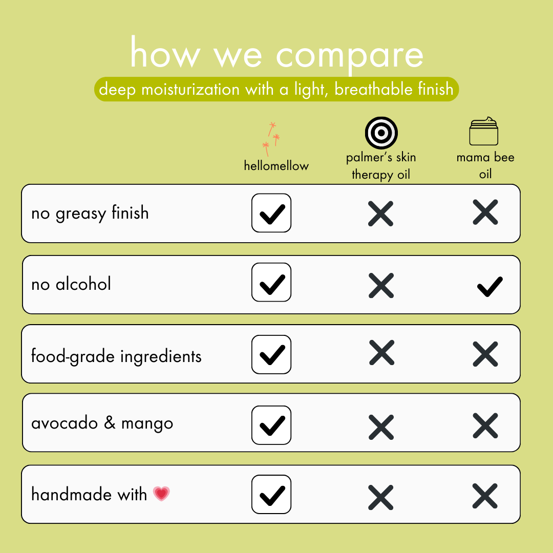 At hellomellow, we choose not to include water in our formulations for a few key reasons. Water can dilute the potency of active ingredients, requiring the addition of preservatives to prevent microbial growth. By formulating our products without water, we can offer more concentrated, effective formulations that harness the full power of our natural ingredients. This approach aligns with our commitment to purity and efficacy, ensuring that every application delivers real, nourishing benefits to your skin without unnecessary additives.