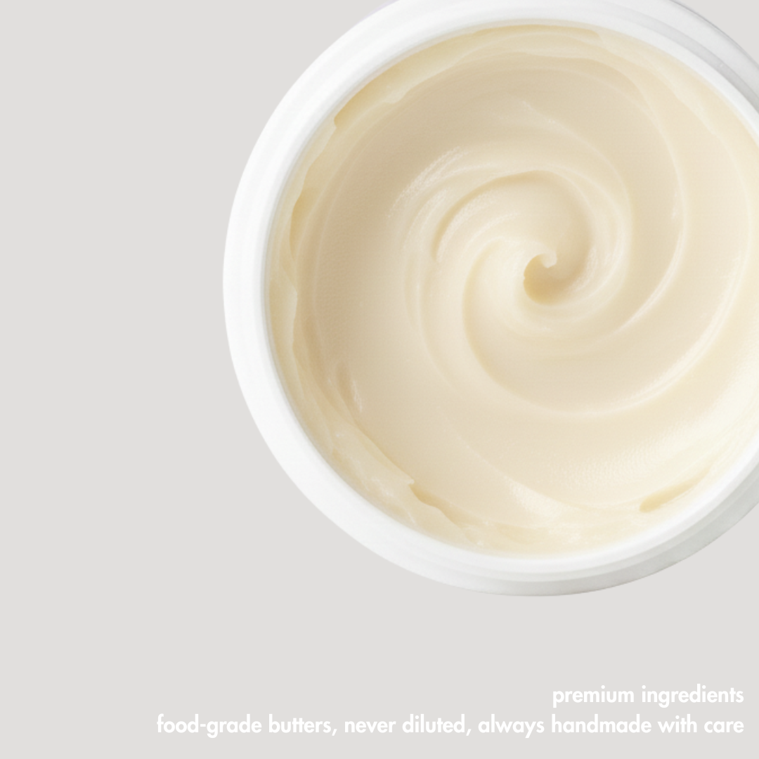 our body butter delivers dense hydration, smooths rough spots, and restores elasticity — without fillers or fluff. applied to dry skin, it melts in deeply, leaving you soft, supple, and resilient all day (and night).